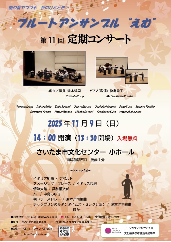 フルートアンサンブル“えむ”では、初心者の方から経験者の方まで、どなたでも楽しめるプログラムをご用意しています。